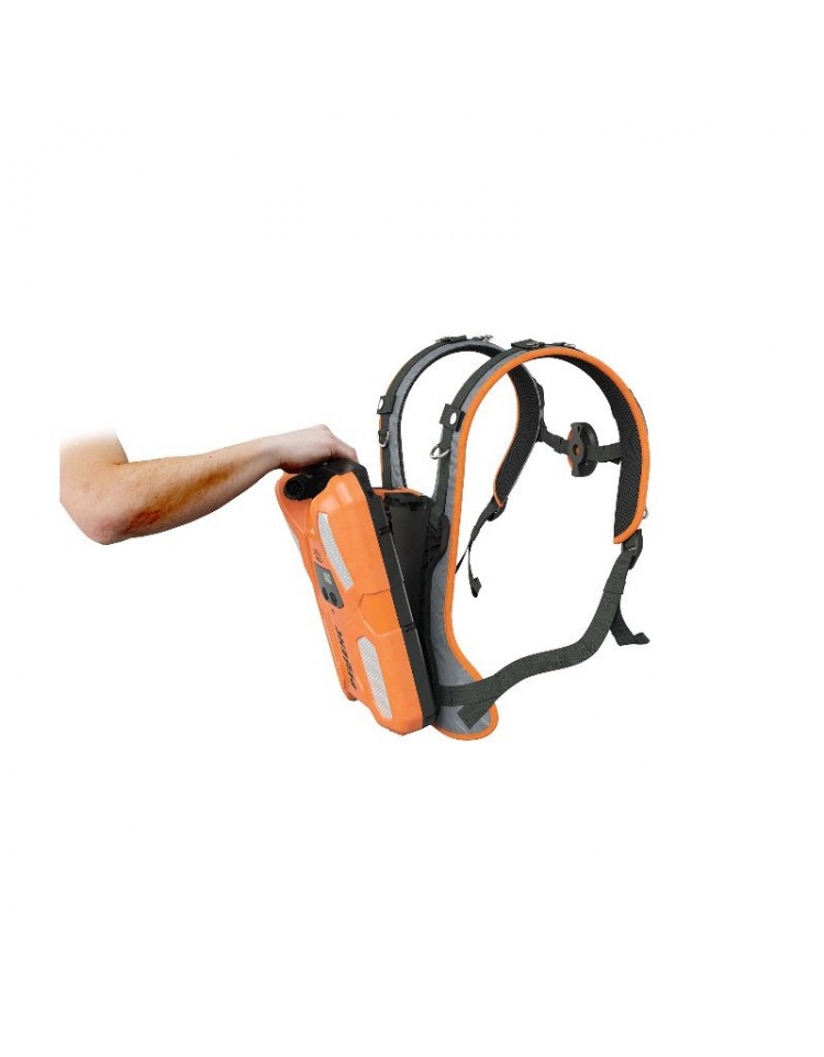Cette sécurité intéressera les élagueurs, des branches pouvant parfois enclencher malencontreusement le bouton-poussoir libérant la batterie. Désormais, une double action – réalisable d’une seule main – s’avère nécessaire pour retirer la batterie de son harnais. Celui-ci propose également une prise à l’avant, au niveau de la poitrine, permettant de connecter un outil à la batterie, même lorsque cette dernière est déjà sur le dos de l’utilisateur.